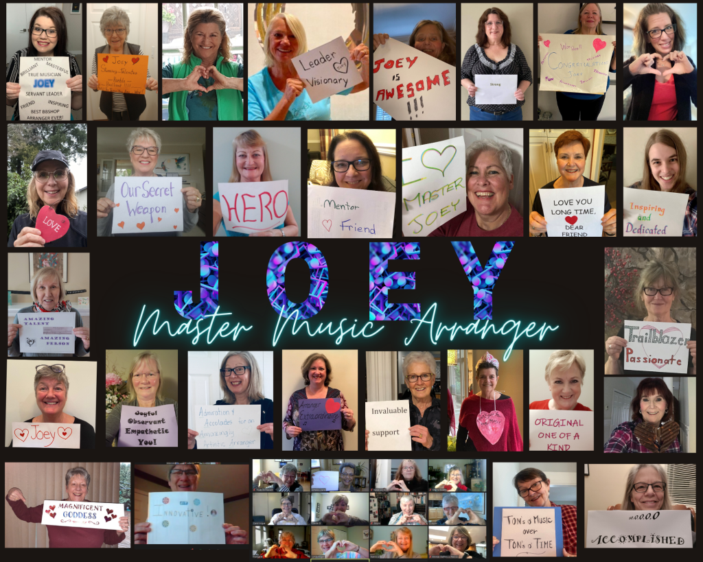 I have so many thank yous to express, I cannot possibly say it all here, yet I will begin by sending my love and appreciation to my ever-supportive Canadian Maple Leaf Region 26, and to my heart-family Anne Downton and Westcoast Harmony Chorus. For their continued confidence in me through many years, my love and thanks to Brava quartet, Sandy Marron and Lions Gate Chorus, The Buzz quartet, Martini quartet, and Dale Syverson and The Rich-Tones Chorus. Enduring gratitude to the SA arrangers who first helped me find my feet: Bev Sellers and Norma Andersen, and the MMAs who taught and inspired me later: Carolyn Schmidt, Lynnell Diamond, and special love and thanks to Marge Bailey. Love forever to my first arranging crush…uhhh…idol, the one-and-only Renee Craig. Last but not least, thank you to Sweet Adelines International for many years of education and encouragement.